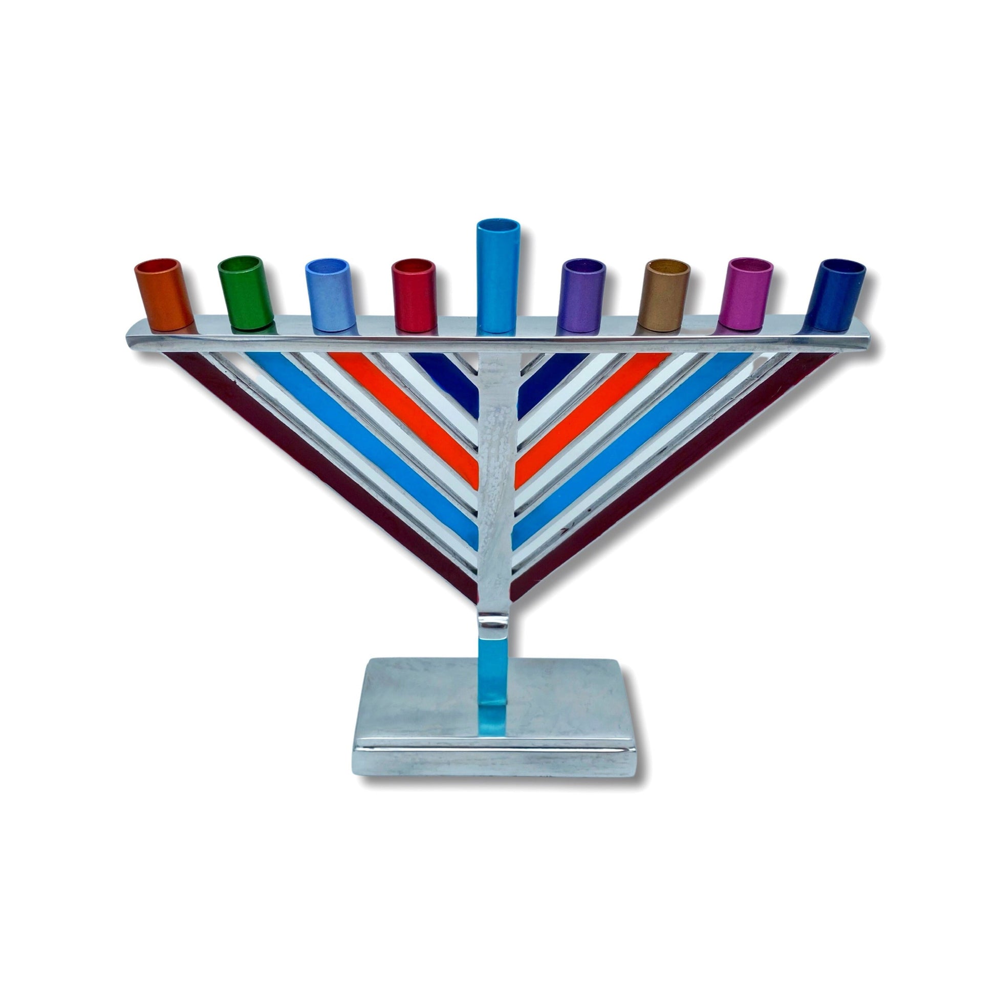 Illuminate your Hanukkah with our exquisite Menorah, where artistry meets tradition. Crafted with precision, the base of the Menorah is meticulously made of aluminum, while the various reeds are adorned with vibrant enamel colors. The upper part features nine reeds, each skillfully fashioned from aluminum and painted in an array of anodized hues.