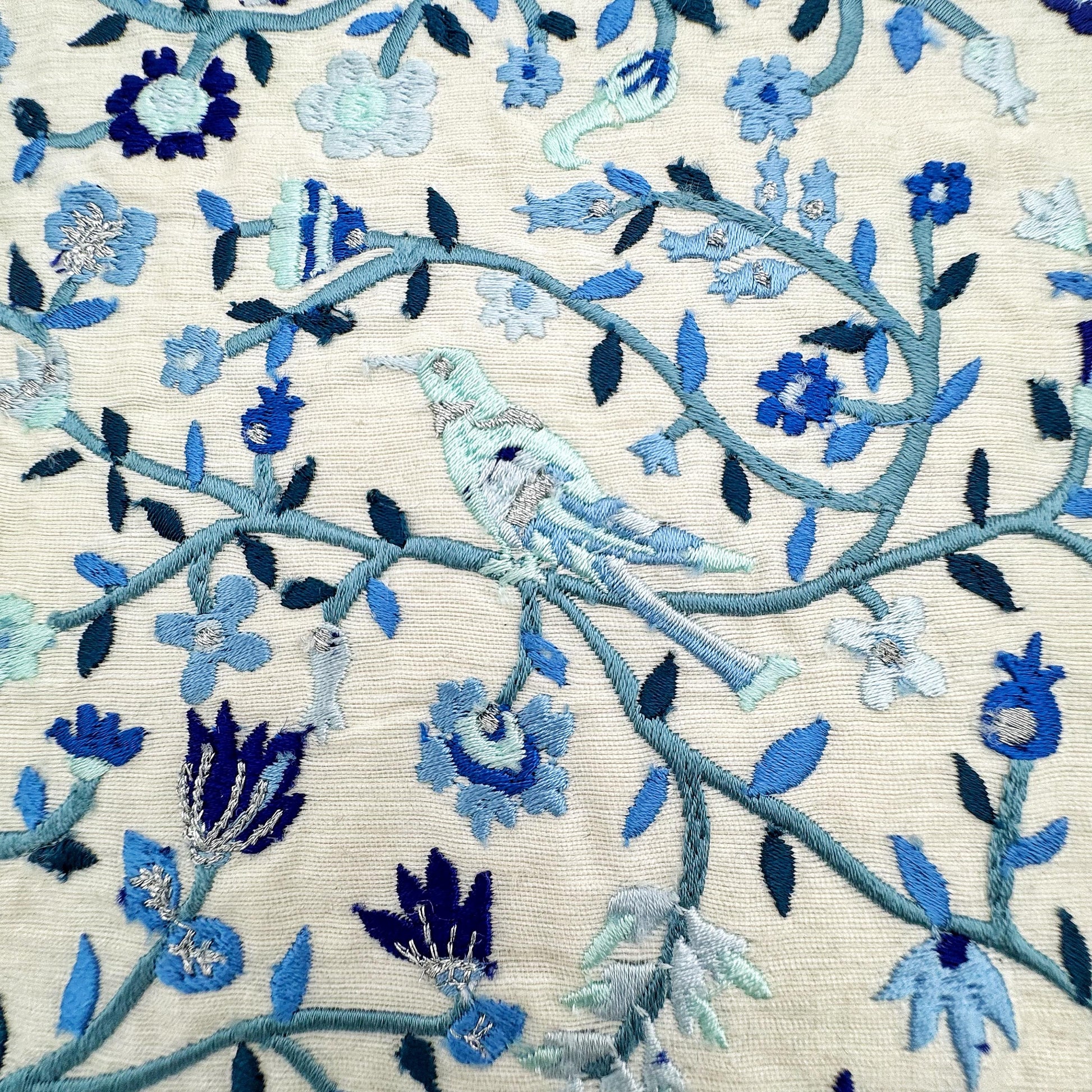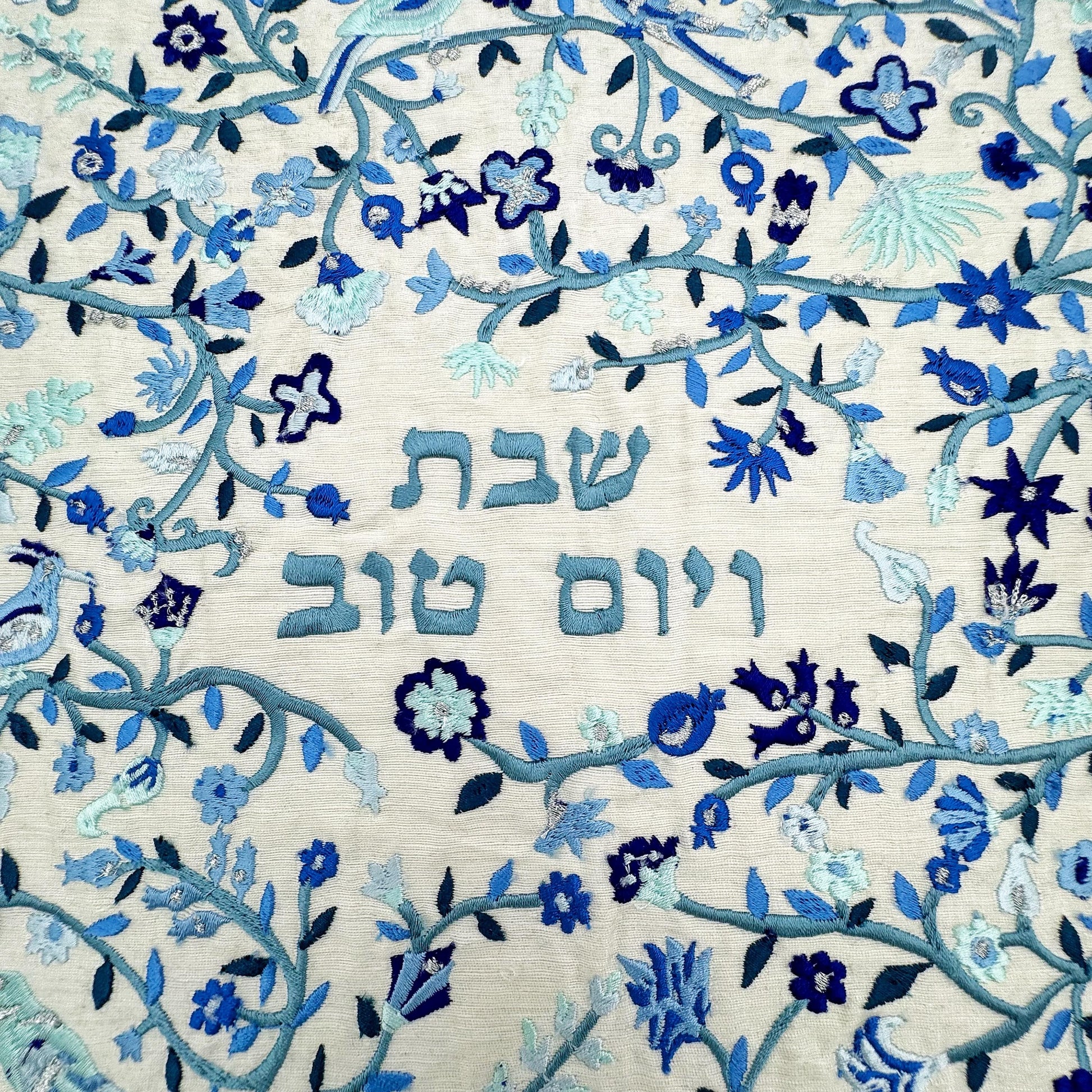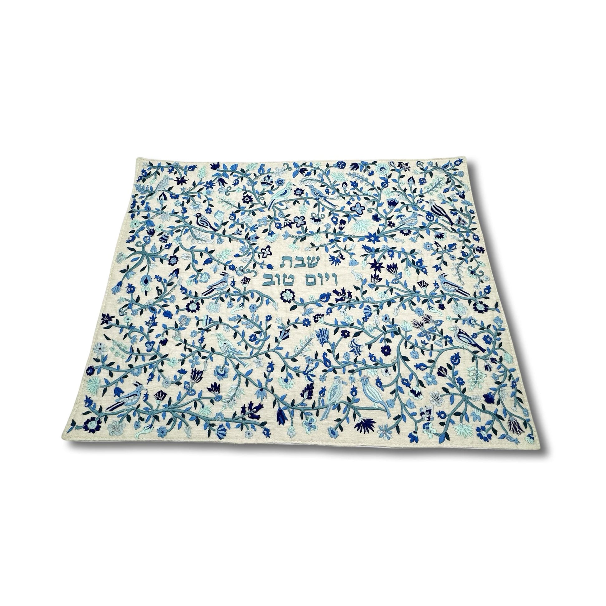 Embroidery Blue Challah Cover Birds and Flowers