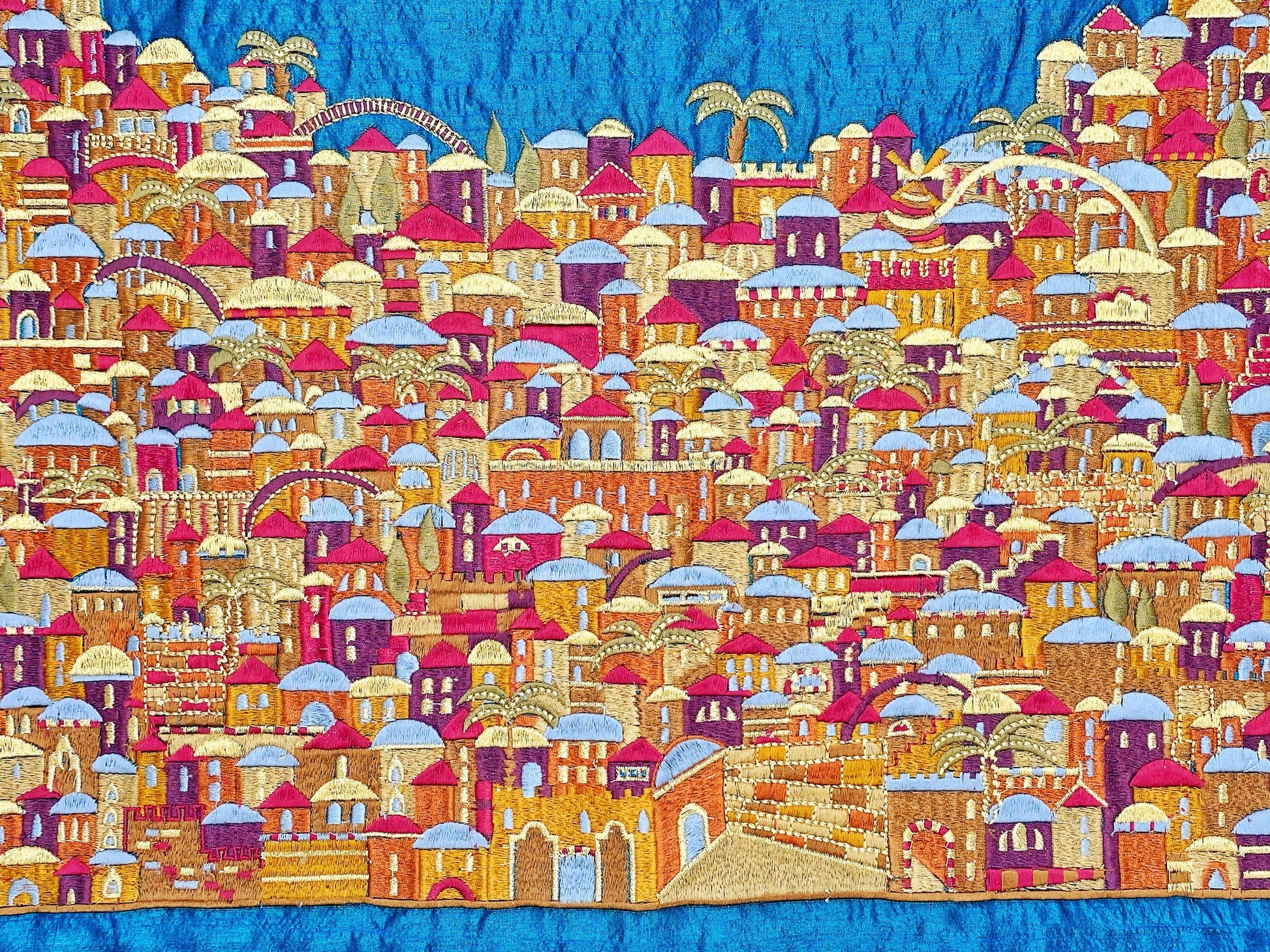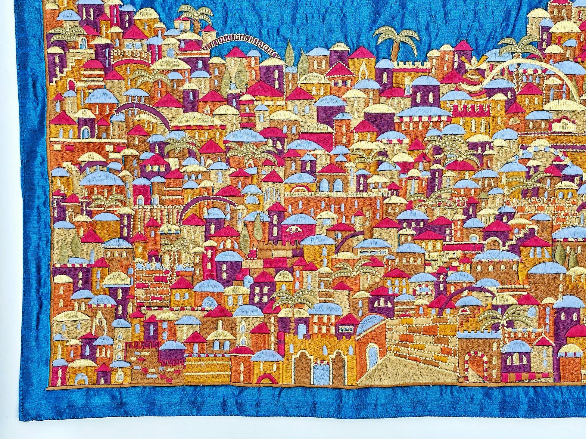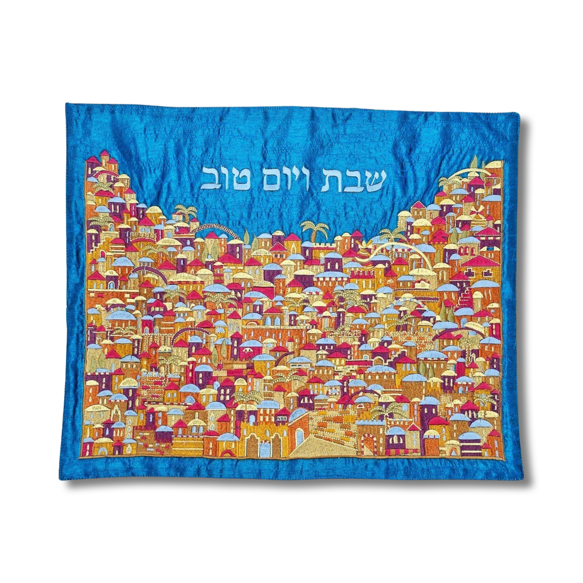 Shabbat shalom unique design with Jerusalem on a blue cover.