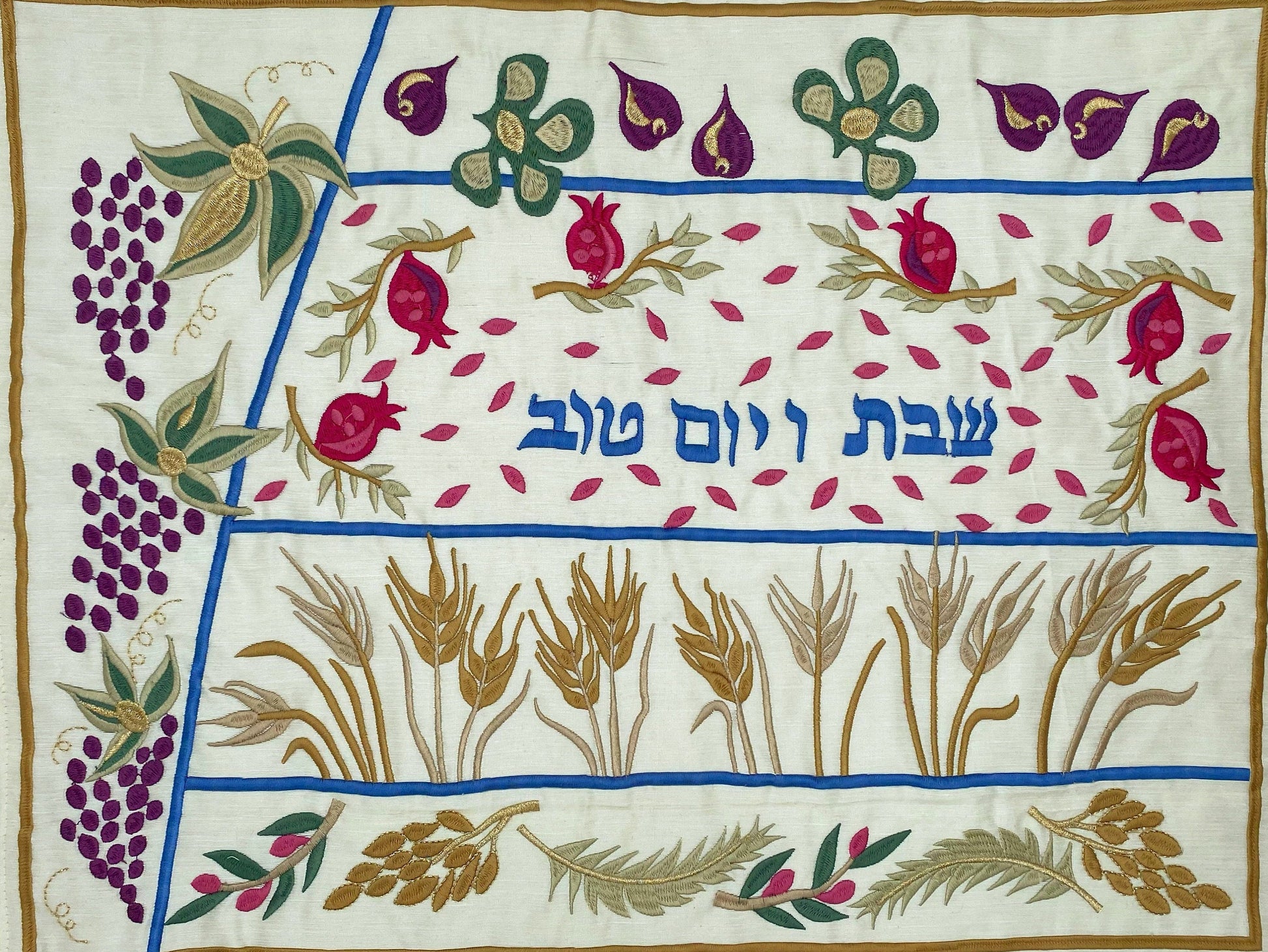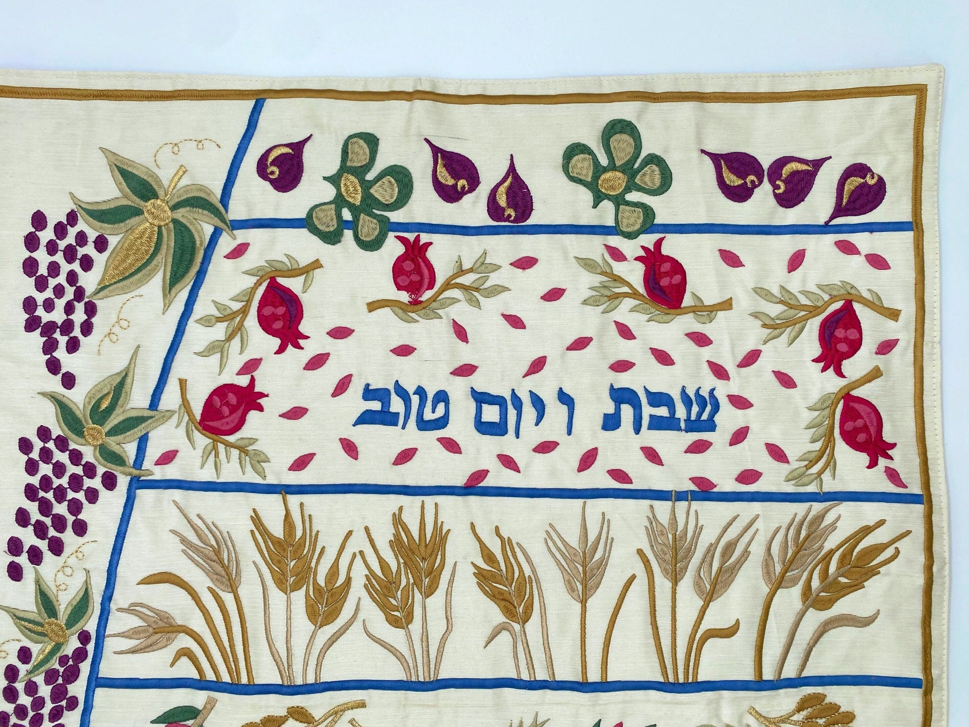 A great Seven Species Design Challah Cover for your Shabbat table, this elegant item can also be a thoughtful gift idea for Jewish housewarmings, holidays, or Shabbat celebrations. The Challah cover serves the purpose of covering the bread during your Shabbat dinner, symbolizing the sanctity of the occasion.