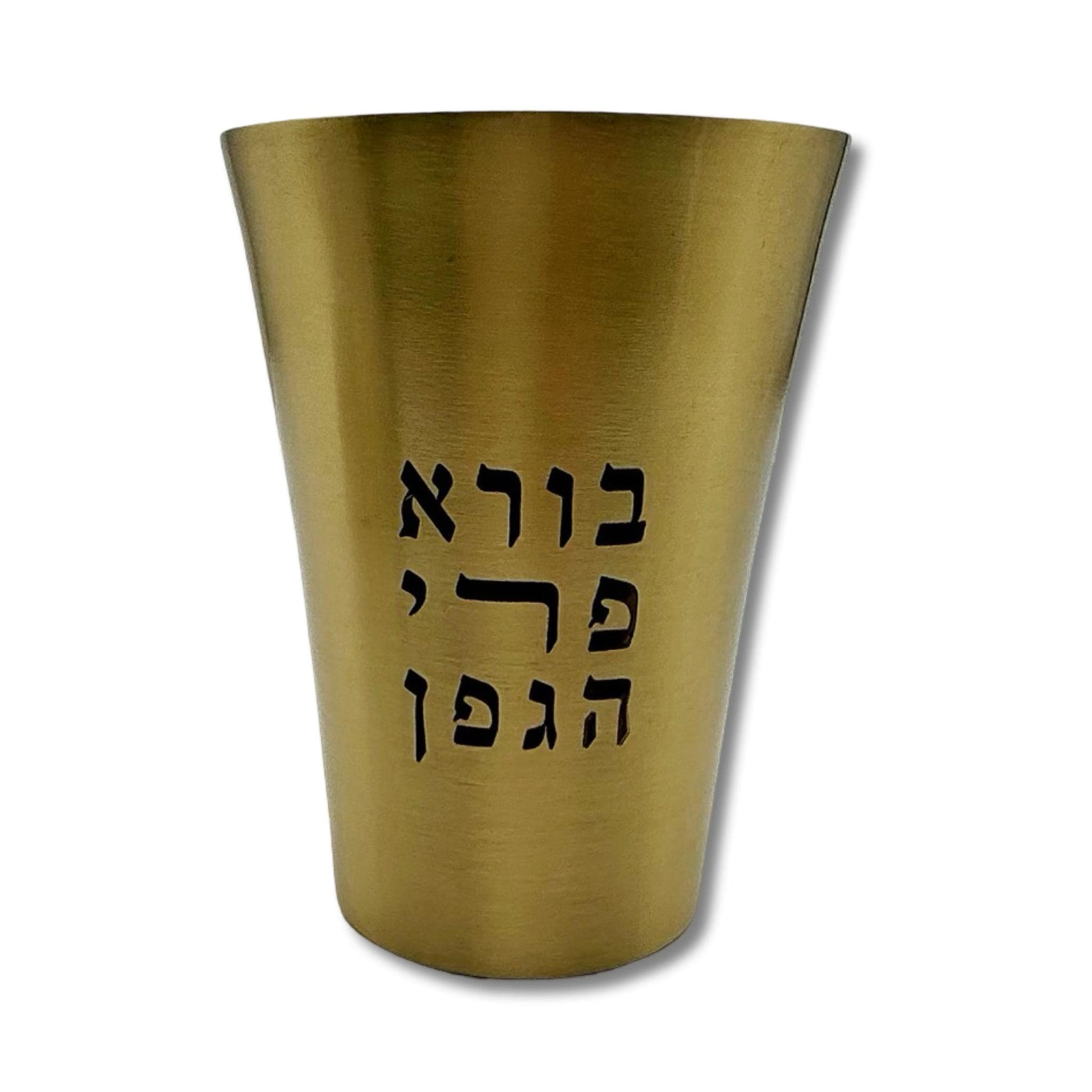 This Kiddush cup is made of Copper and has the blessing of Shabbat the creator of vines in Hebrew caption.