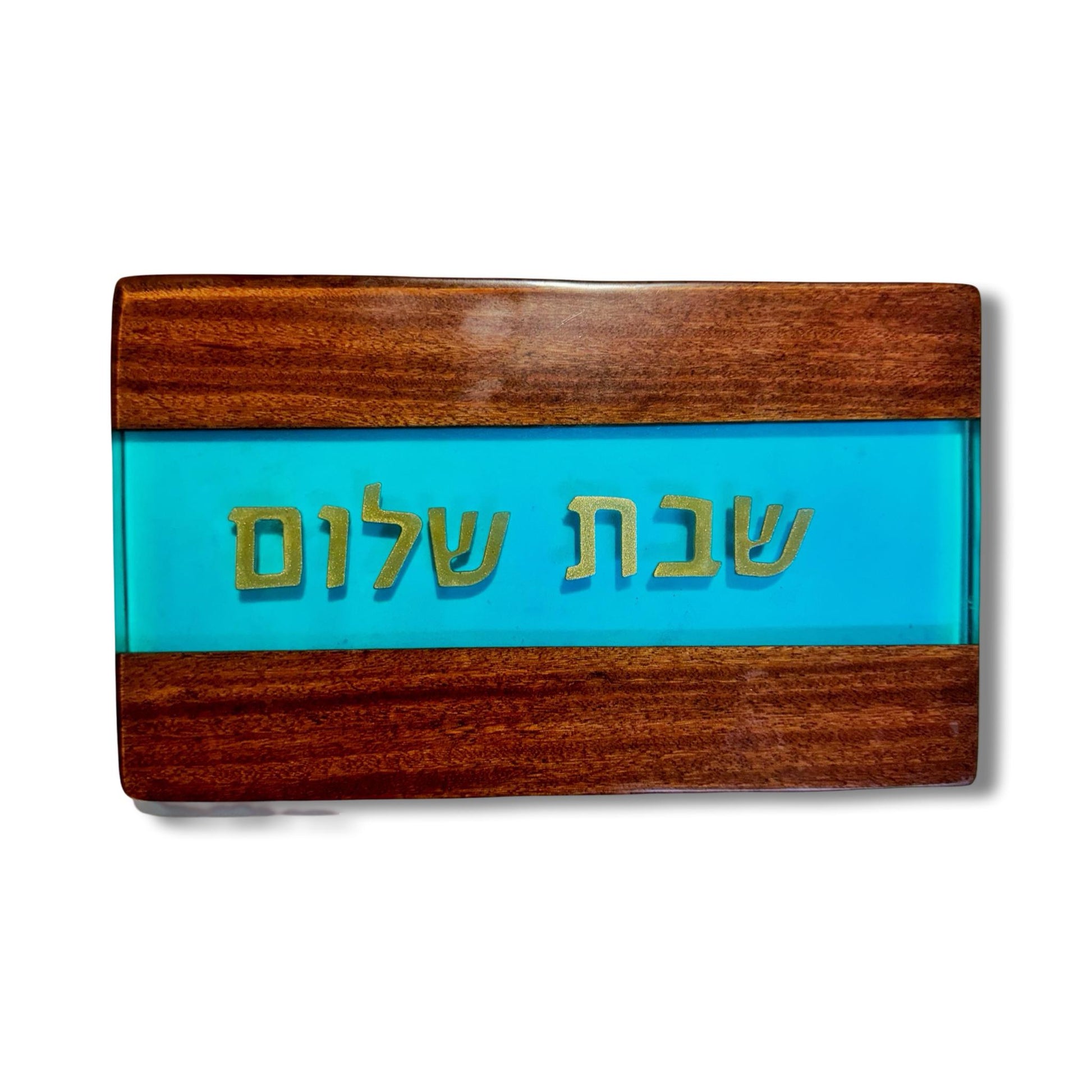 Shabbat challah board, crafted from premium API wood and featuring a captivating blue transparent epoxy and resin river design. Made in Israel, this unique piece blends artistry with functionality, making it a perfect centerpiece for your Shabbat table.