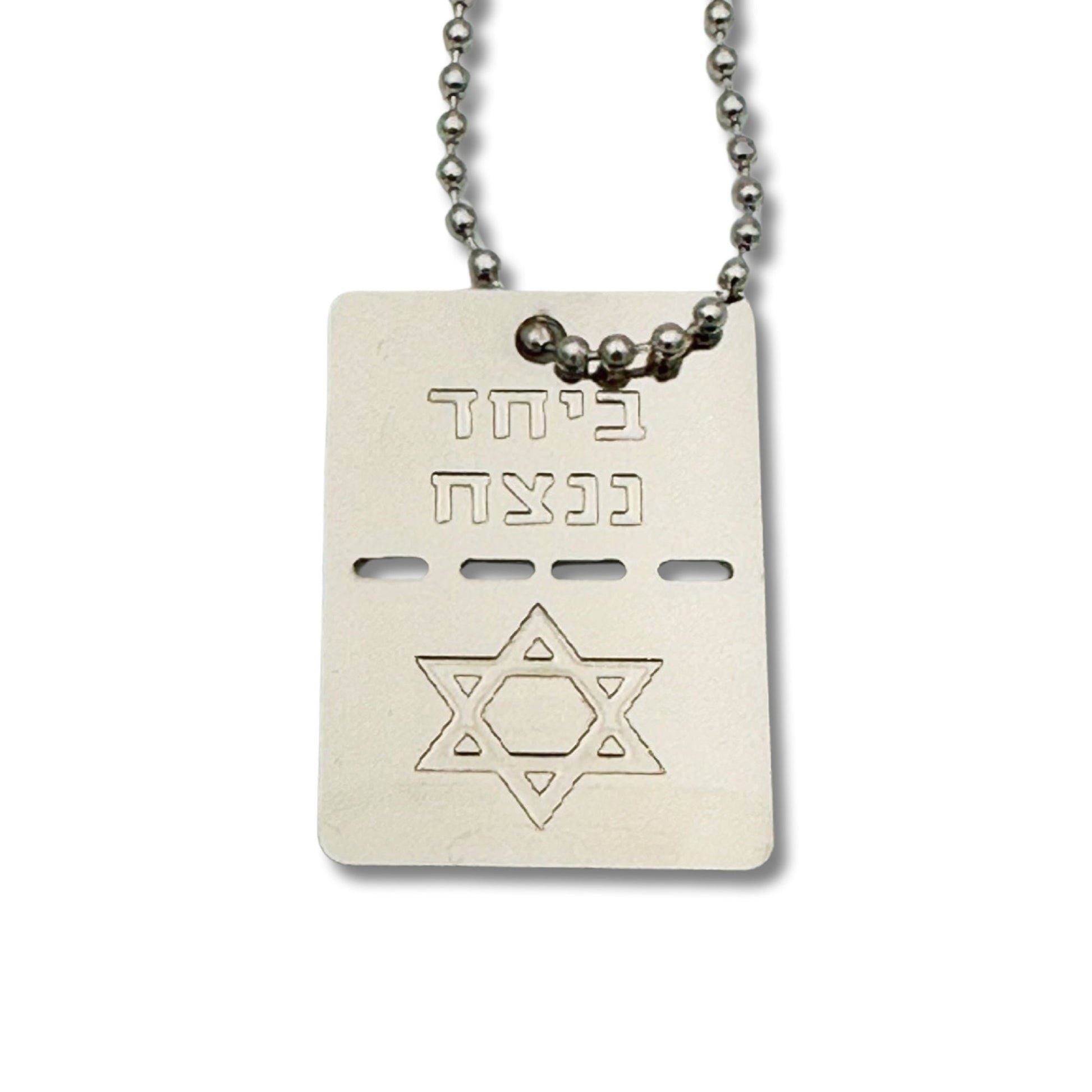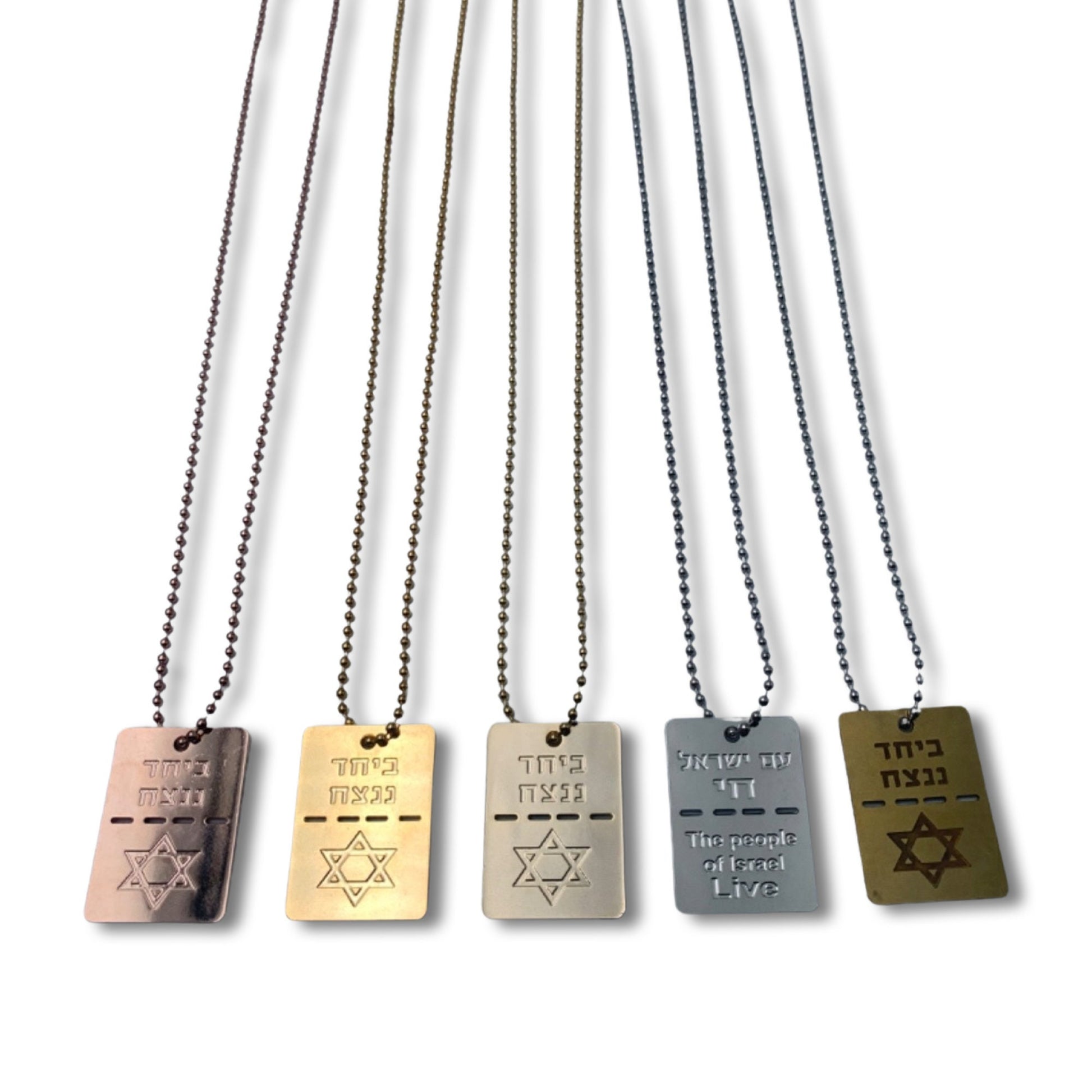 The people of Israel live caption in English & Hebrew necklace/military tag together we will win in Hebrew.