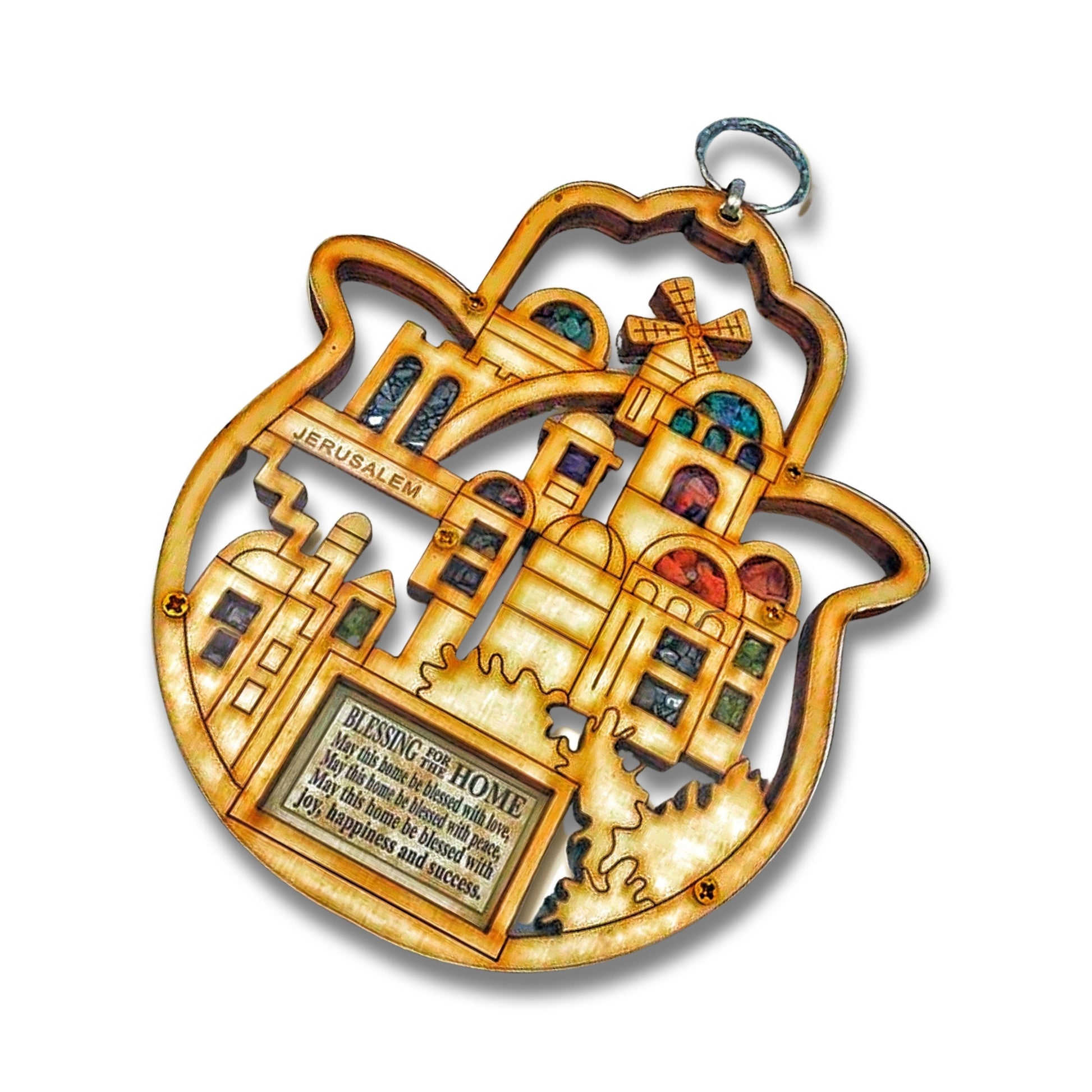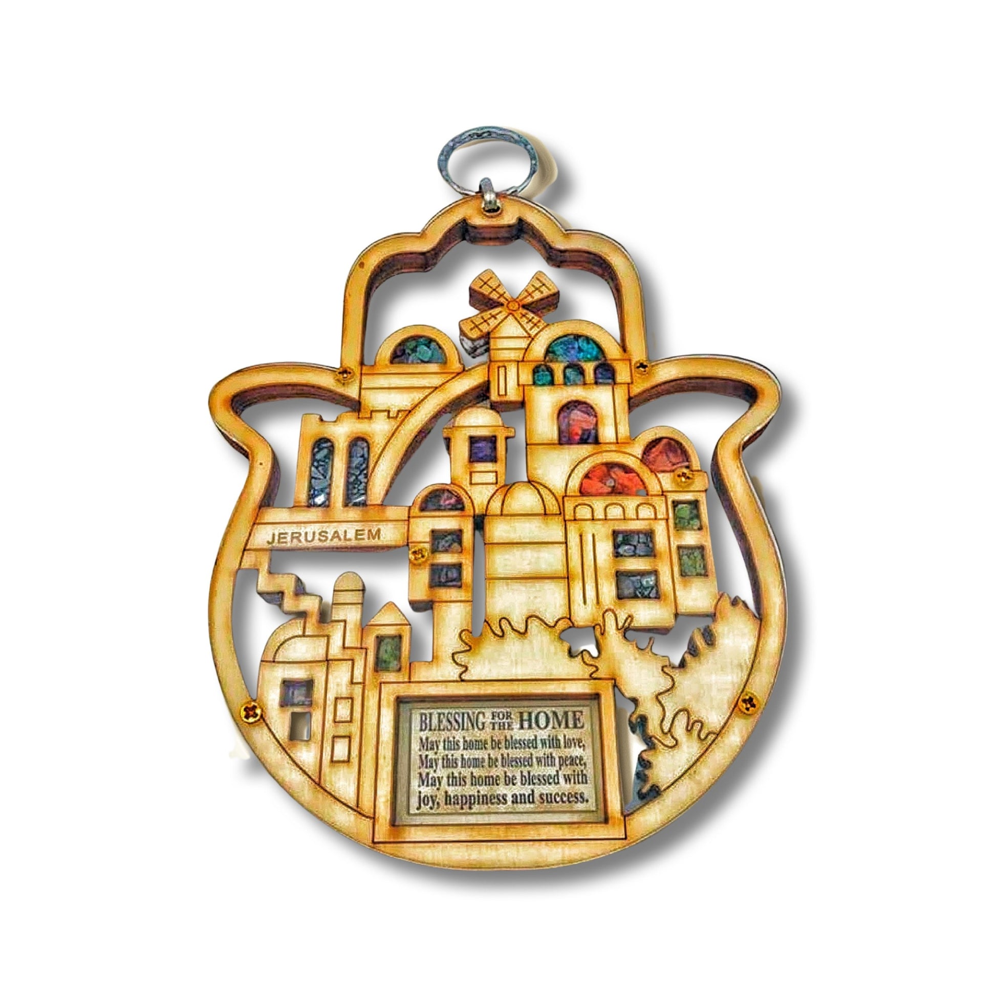 Elevate the cultural and spiritual atmosphere of your home with our Jerusalem Design Hamsa Wood Wall Art. Each piece is meticulously crafted in a small workshop in Israel, showcasing exceptional artistry and faith.